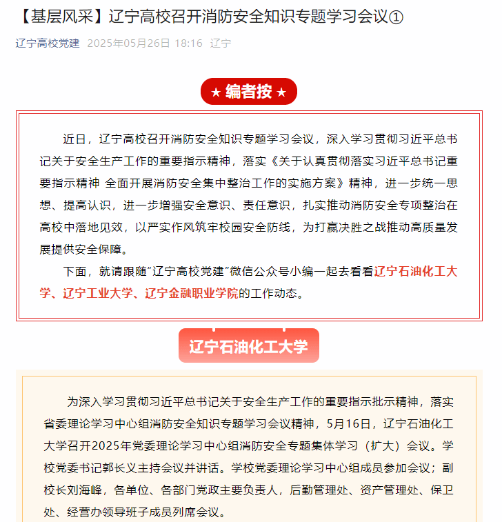 编者按:近日,辽宁高校召开消防安全知识专题学习会议,深入学习贯彻习近平总书记关于安全生产工作的重要指示精神,落实《关于认真贯彻落实习近平总书记重要指示精神 全面开展消防安全集中整治工作的实施方案》精神,进一步统一思想、提高认识,进一步增强安全意识、责任意识,扎实推动消防安全专项整治在高校中落地见效,以严实作风筑牢校园安全防线,为打赢决胜之战推动高质量发展提供安全保障。5月26日,辽宁高校党建微信公众号发文对我校召开2025年党委理论学习中心组消防安全专题集体学习(扩大)会议进行了宣传报道。现将相关报道转载如下: