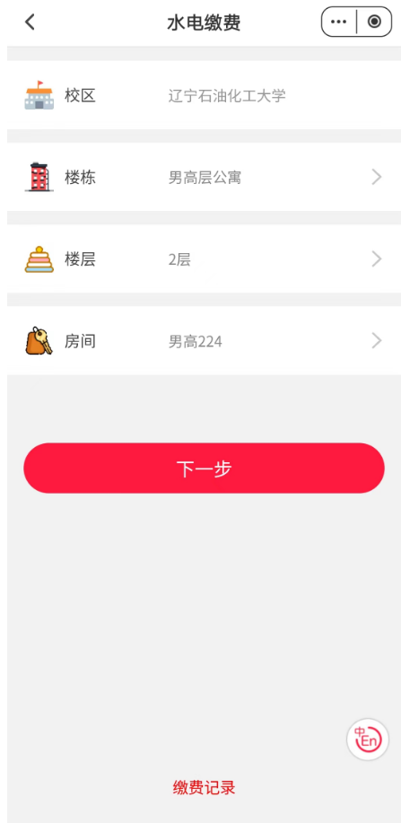 2.输入“楼栋、楼层及房间号”,点击“下一步”。