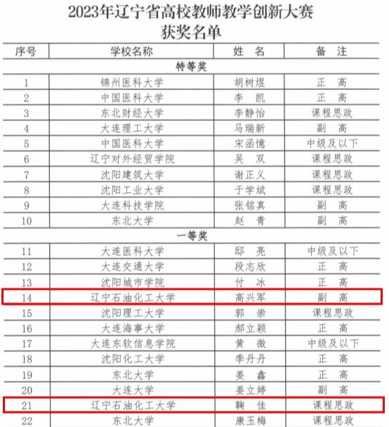日前,辽宁省教育厅发布《辽宁省教育厅关于公布2023年辽宁省高校教师教学创新大赛获奖名单的通知》辽教通〔2023〕146号,我校教师荣获一等奖2项,二等奖3项,三等奖7项;学校获得辽宁省高校教师教学创新大赛优秀组织奖。